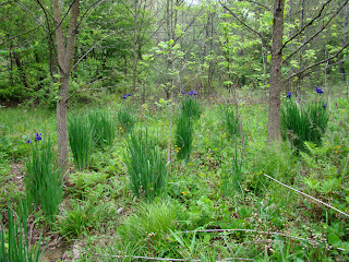 We have a wet mushy place on our property where the creek comes out from under two ginormous beech trees. It's a perfect place for siberian iris and mint and a nice swamp rose. The iris are blooming now. It's hard to get a fabulous nature mag type pic because this place has a microclimate all its own. The iris don't bloom at the same time - even though they're all the same kind. Weird.